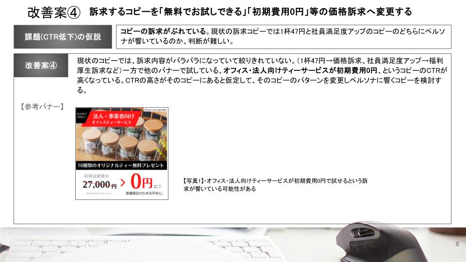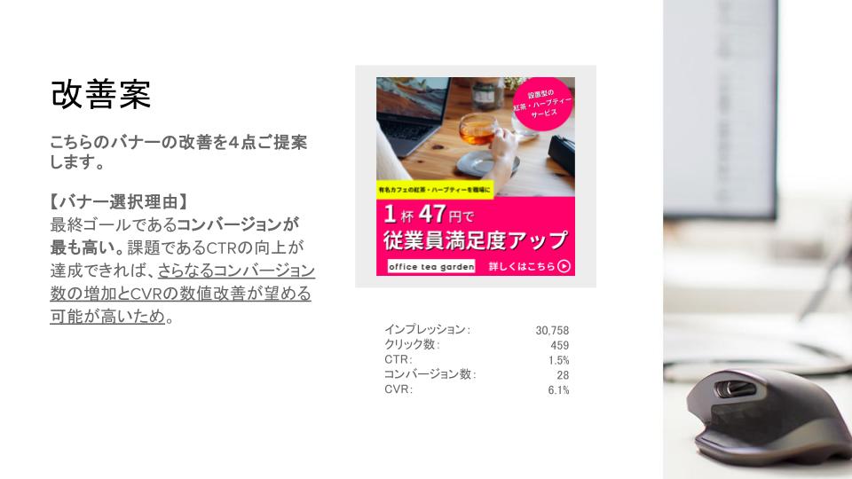 現状のバナーの色やコピーが、設定したターゲットに刺さるデザインではないことがCVに影響しているのではないかと仮説を立てました。