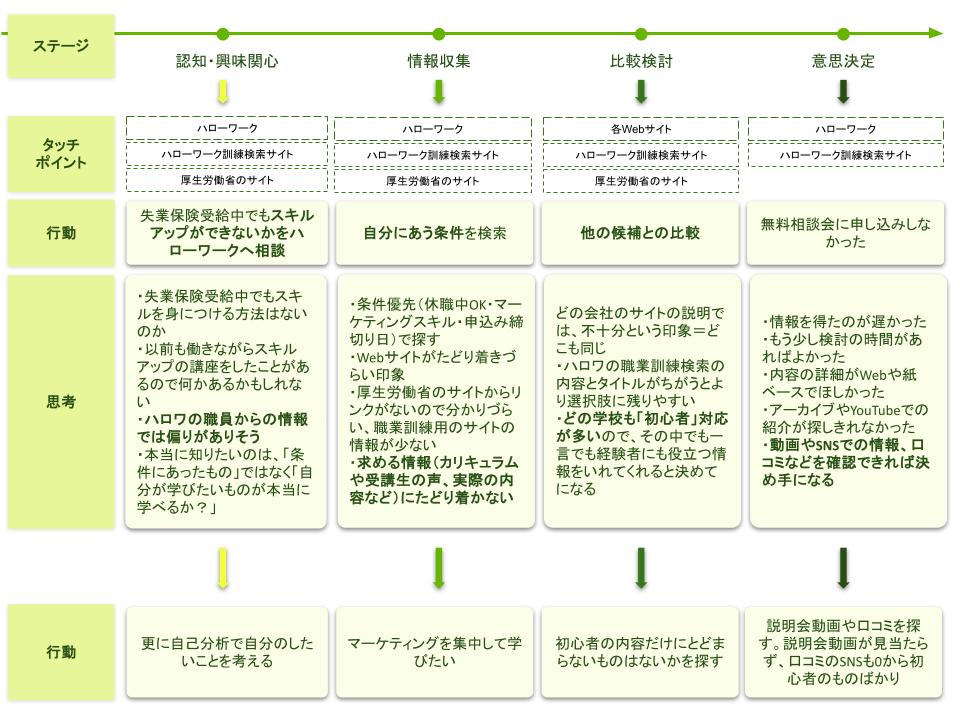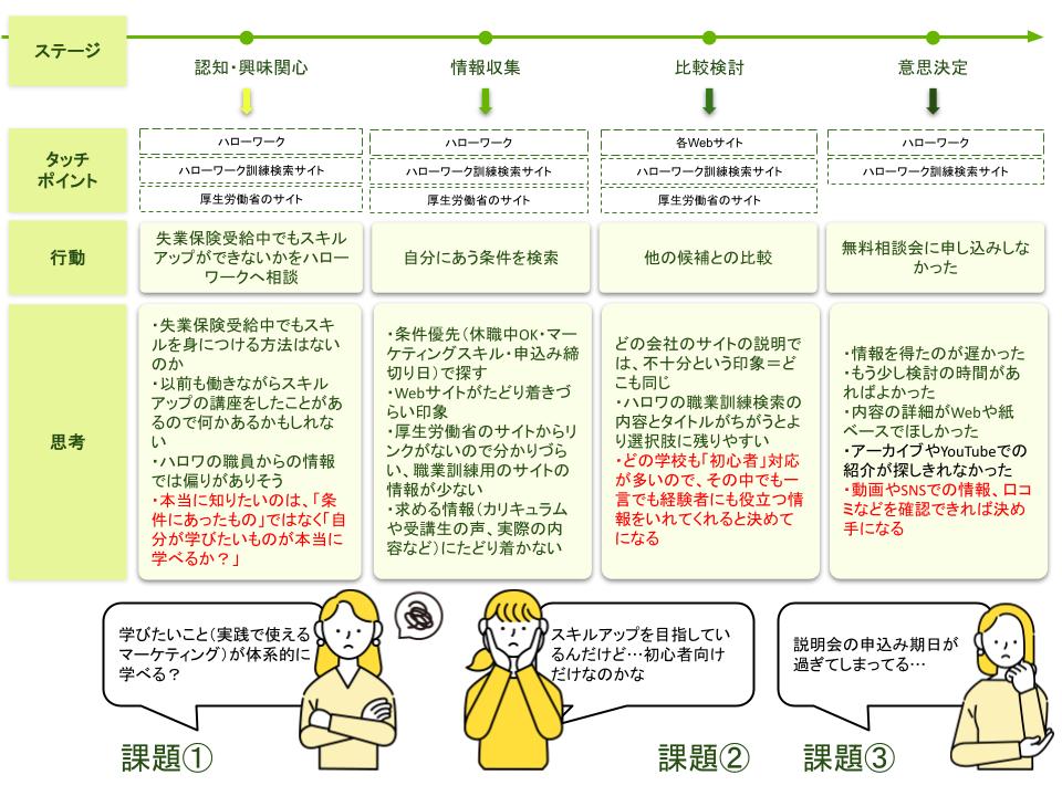 ペルソナの設定、カスタマージャーニーの作成、調査(アンケート・インタビュー)など元にして、仮説や調査結果をまとめて、最終的に課題解決のために何をしていくべきかを整理した報告書の作成をしました。