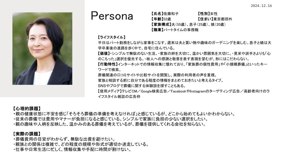 ですので、今回考えたターゲットは「緊急の葬儀」を考えているのではなく、先々葬儀が必要と考えている人やこだわりのある葬儀を望む人としました。