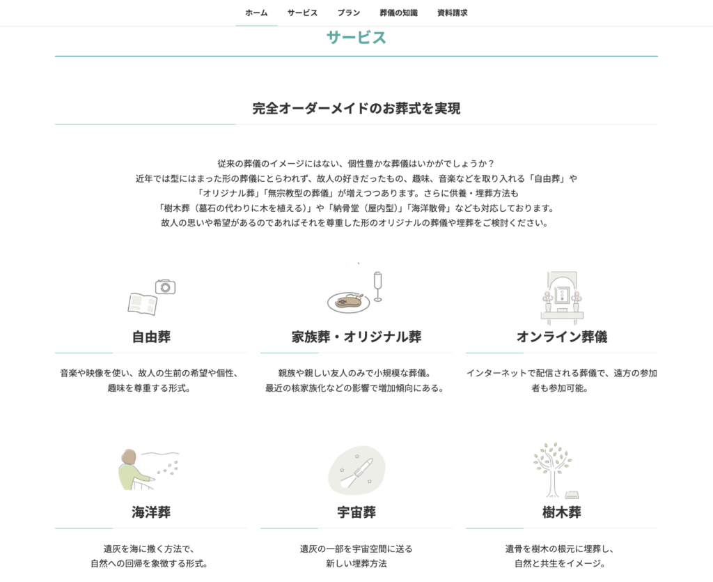 ダミーサイトを作成するために、現状の家族葬や自由葬の葬儀会社のサイトを調べました。